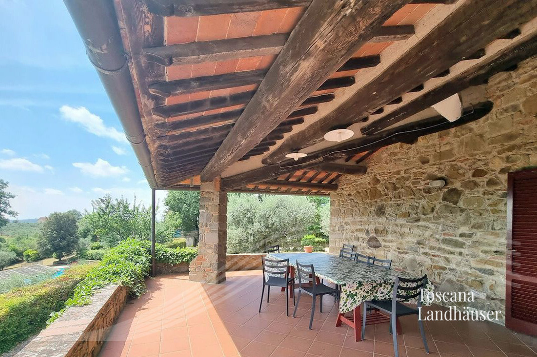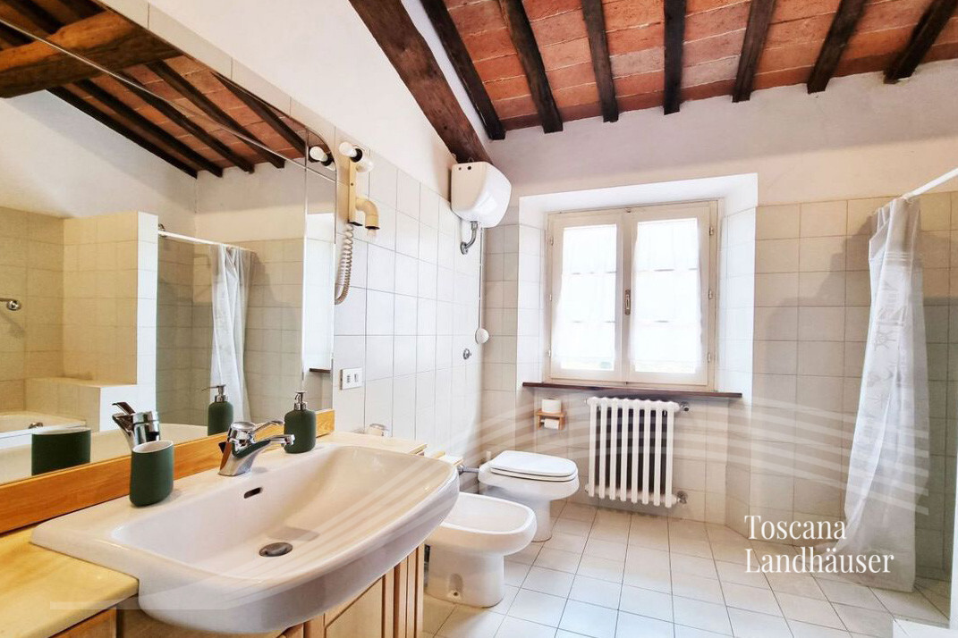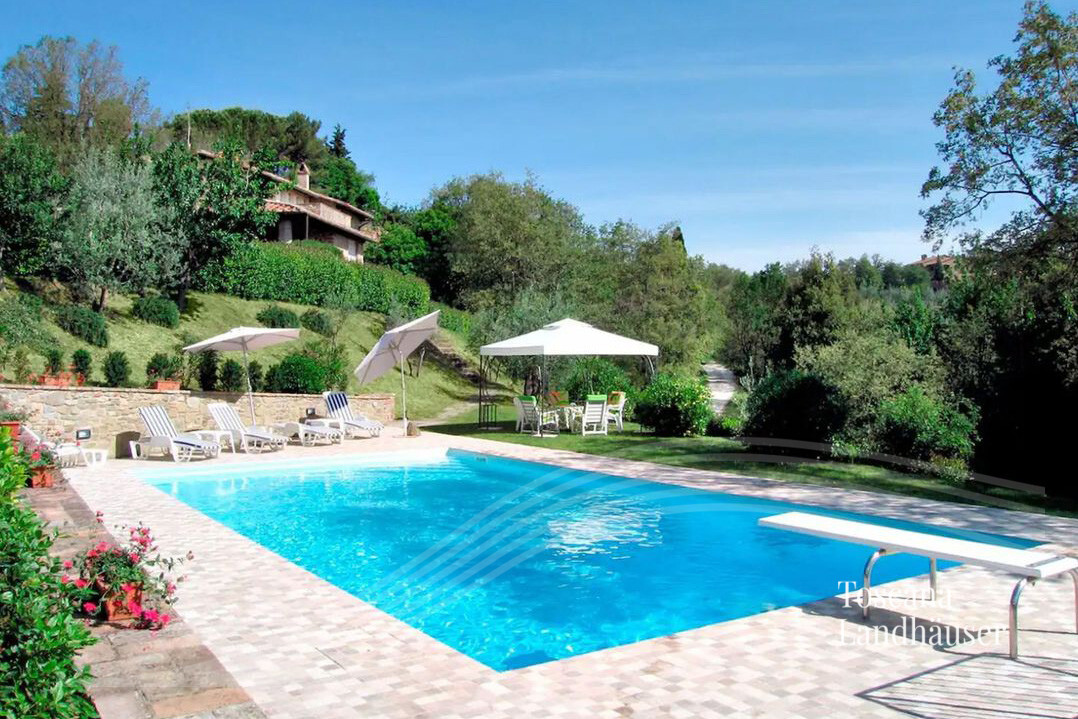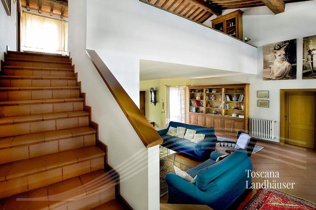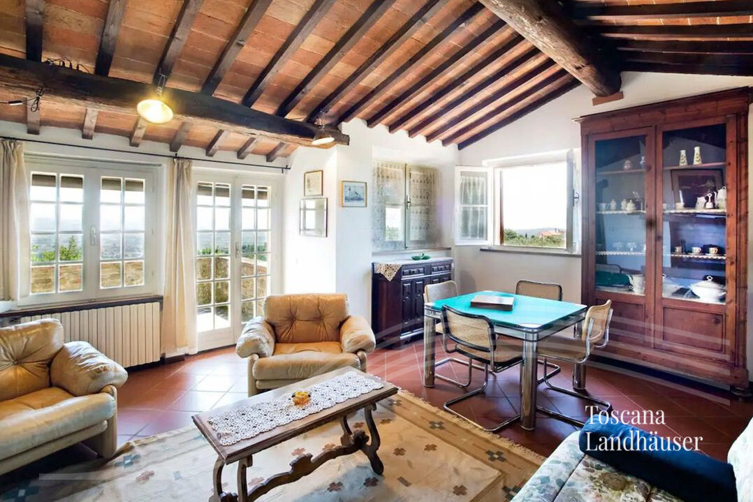 In the middle of the green hills of Monte San Savino is this natural stone house. It offers a living area of about 350 sqm on three levels and a garden of about 3,820 sqm with pool. The typical farmhouse has terracotta floors and wooden beams, creating a cozy atmosphere in harmony with the surroundings. It is suitable as a main or vacation residence due to its location and the layout of the premises, although tourist rental is also possible.