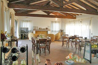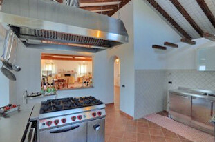 in einem Flügel befindet sich der große Wohn- Essbereich mit offenem Kamin und zwei extra großen Fenstern, welche einen traumhaften Blick auf den Innenhof und das Meer bieten, daran angeschlossen befindet sich eine moderne Profiküche, vom Wohnbereich aus geht man auf die große Veranda mit einem Holzofen und einem Grill, Gäste-Badezimmer, Abstellkammer